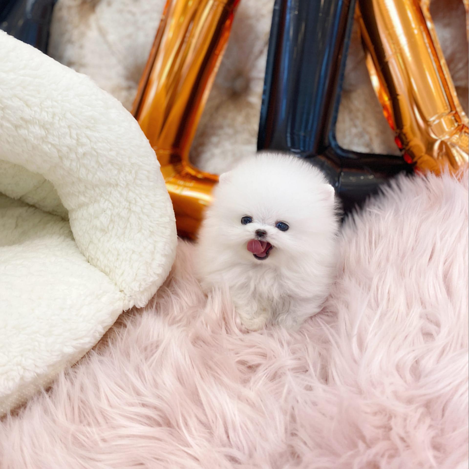 너무 사랑스러운 화이트 포메라니안 강아지가 새로운 가족을 기다리고 있습니다.
